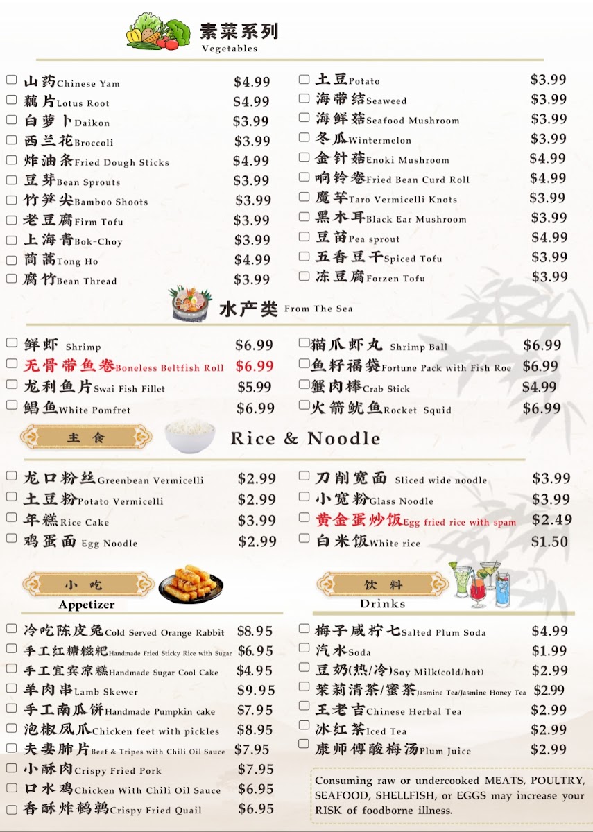 Welcome to XIAN HOT POT 川鲜汇火锅, a culinary treasure located at 316 N Washington St, Rockville, MD. This restaurant specializes in authentic hot pot offerings that promise an explosion of flavor. The menu features enticing options like the Deluxe Combo, perfect for two, showcasing premium ingredients with customizable spice levels at just $34.95. For solo diners, the Roasted Duck Combo offers succulent flavors, while the Vegetable Combo satisfies plant lovers with vibrant, spicy dishes.